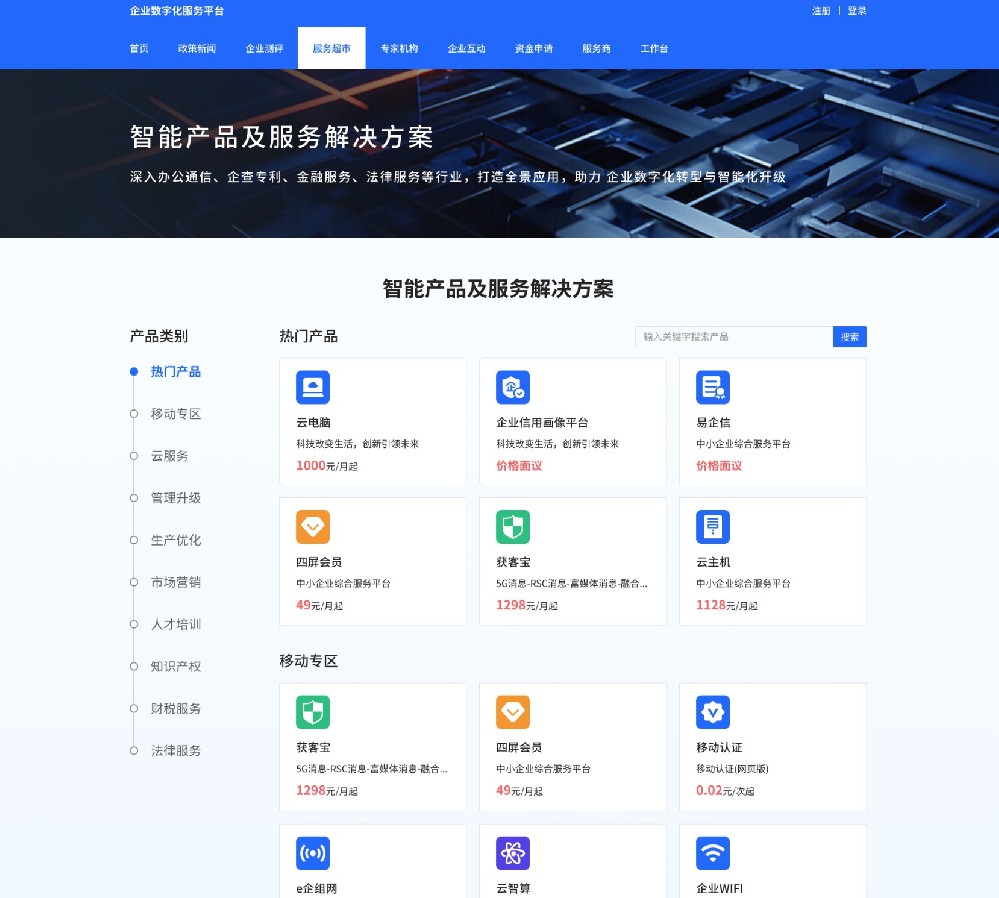 企业数字化服务平台是一款可覆盖政府机构、街道园区及商业综合体在数字化转型工作中的重要平台级产品。平台通过提供 政策新闻、企业数字化评测、服务商城、政企互动及个人中心等功能,将政府机构、园区街道、产品服务提供商、中小企业 有机结合,实现各方价值诉求,提高企业数字化水平,加强政府与企业之间的互动,推进区域经济高质量发展。